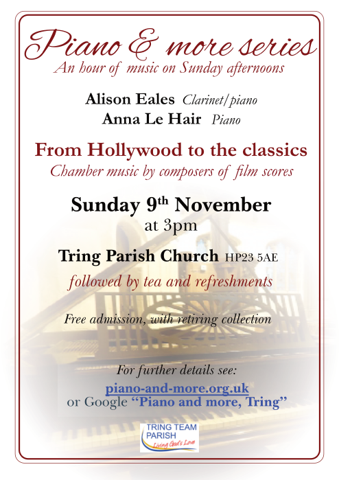 The November concert sees Hollywood meeting the Classics! Alison Eales (clarinet and piano) and Anna Le Hair (piano) play a programme of music by composers better known for their film scores, but who also wrote wonderful (and accessible) music in a mainstream classical style. Full programme details will be posted soon. As usual, entrance is free but donations are welcome; tea and refreshments will be served after the concert.